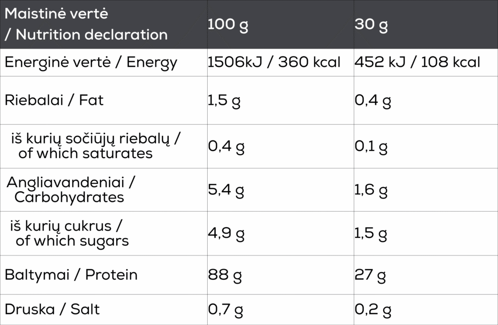 Vartojimo instrukcija: Sumaišyti 1 kaušelį miltelių (30g) su 200-300ml vandens arba pieno. Prieš vartojant gerai suplakti.
